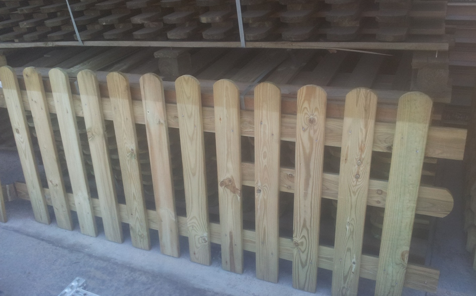 La staccionata con trattamento in autoclave di 4° classe -è composta da sezioni di lunghezza 200 cm, composte da 12 doghe piallate 9 x 2 cm con la parte superiore arrotondata, fissate su correnti orizzontali ogni 6,5 cm con chiodi zincati.