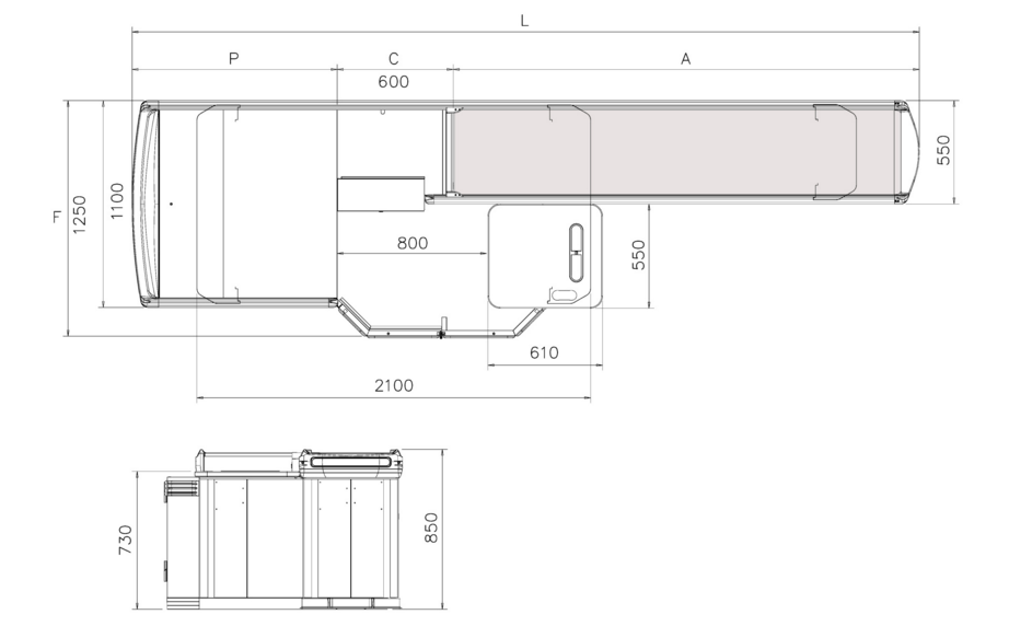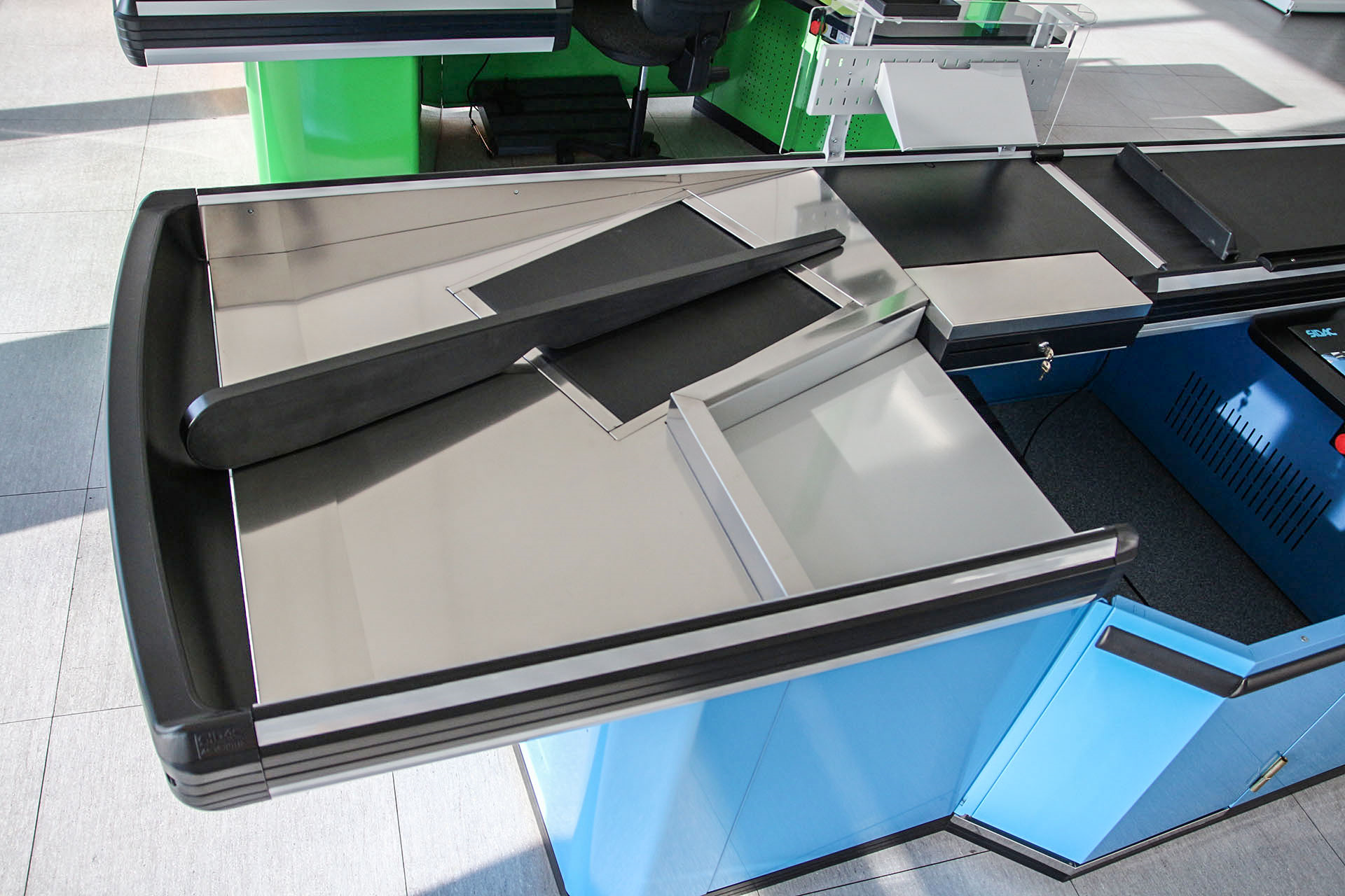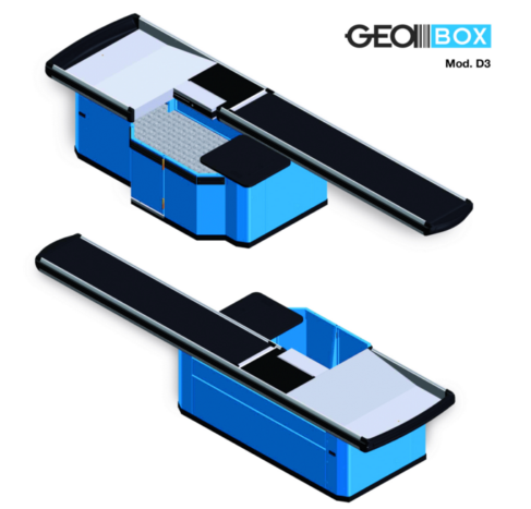 Banco cassa tradizionale adeguato per dimensione e funzione a tutte le aree vendita dal Superette o minimercato (superficie di vendita tra i 100 ed i 399 m²) all'Ipermercato (superficie di vendita superiore ai 2500 m²). L'ampiezza della vasca posteriore permette l'insacchettamento della merce per due clienti contemporaneamente ed offre quindi un adeguato servizio pur contenendo l'ingombro totale. La parte centrale - da 600 mm - permette l'alloggiamento dello scanner e del cassetto portamonete ribaltabile consentendo all'operatore di lavorare in posizione ergonomica e frontale rispetto al cliente.