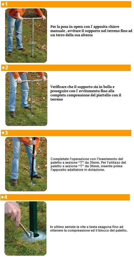 Le prove sono state effettuate posizionando i supporti nel terreno mediante “avvitamento” ed utilizzando un estrattore meccanico collegato ad un dinamometro. Le prove sono state realizzate su terreni superficiali, con umidità naturale e non saturi d’acqua. ATTENZIONE: i dati riportati nelle tabelle di tenuta a trazione verticale e orizzontale, sono l'esito di un media calcolata su prove effettuate su 20 terreni a composizione similare per ogni tipologia di terreno. Essendo tali risultati frutto di una media e riscontrando risultati diversi a seconda della compattezza del terreno, le tabelle devono essere utilizzate a scopo indicativo ISTRUZIONI DI POSA: