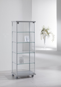 Vetrina con profili in alluminio – cristalli temperati – no. 1 anta battente con serratura – no. 4 ripiani regolabili in altezza – top legno – base su ruote.PESO 50 kg DIMENSIONI 53 x 39 x 141 cm