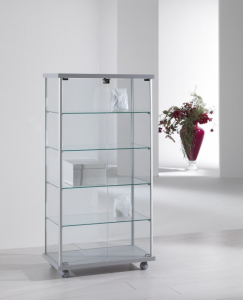 Vetrina con profili in alluminio – cristalli temperati – no. 2 ante battenti con serratura – no. 4 ripiani regolabili in altezza – top legno – base su ruote-PESO 67 kg DIMENSIONI 73 x 39 x 141 cm