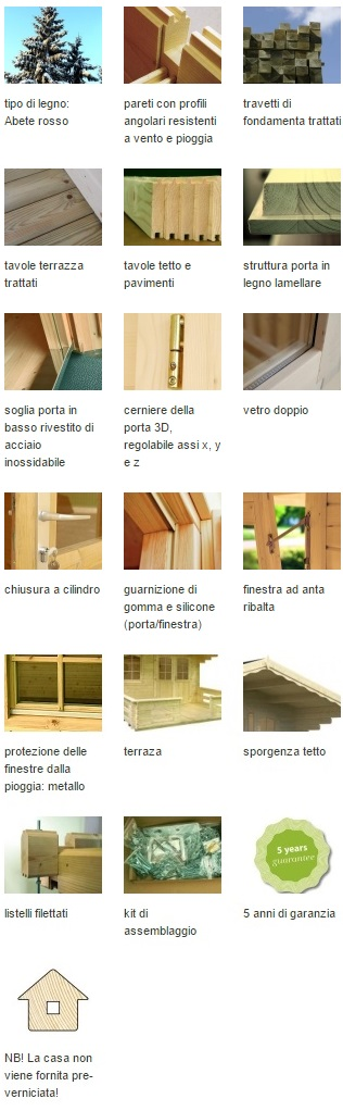 NB! Il contenuto del pacco può variare a seconda del modello. La descrizione di ogni modello di casetta include l’elenco dei dettagli essenziali.