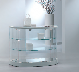 Banco Vetrina semiovale cristalli temperati - ripiani regolabili in altezza - Basi e Top H 9 cm - base a specchio - Dimensioni 112 x 38 x h 87 cm - Con faretti a led 4000° K su due lati.