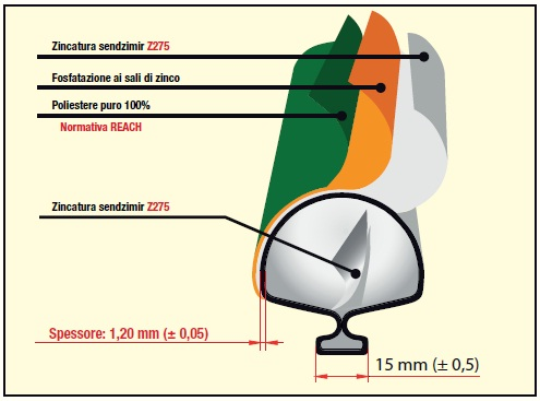 PFZ: Zincatura Sendzimir + Fosfatazione ai sali di zinco + Plastificazione con poliestere. La lamiera di acciaio utilizzata per produrre il tubolare è sottoposta ad un processo di zincatura in continuo (denominato “Sendzimir”) in vasche contenenti zinco puro a 500° direttamente presso l’acciaieria in fase di produzione. Successivamente, i pali sono sottoposti al trattamento di plastificazione che prevede 7 fasi di lavorazione che assicurano la massima resistenza e durabilità al prodotto. La prima fase prevede una leggera sabbiatura (1) che pulisce il supporto dalle impurità residue della zincatura creando le indispensabili condizioni per un ideale ancoraggio delle resine plastiche. Tramite il degrassaggio (2) viene poi eliminato ogni residuo superficiale di olio, grasso e polvere e successivamente un’ulteriore lavaggio (3) elimina altre eventuali impurità e residui del degrassaggio. A questo punto inizia il ciclo di fosfatazione : lavaggio con acqua demineralizzata, applicazione di fosfati di zinco (4). Il prodotto viene poi asciugato (5) in forno a 120° in preparazione alla successiva fase di plastificazione (6) con resine di poliestere puro al 100%. Attraverso la polimerizzazione (7) lo strato di poliestere viene fissato al supporto.