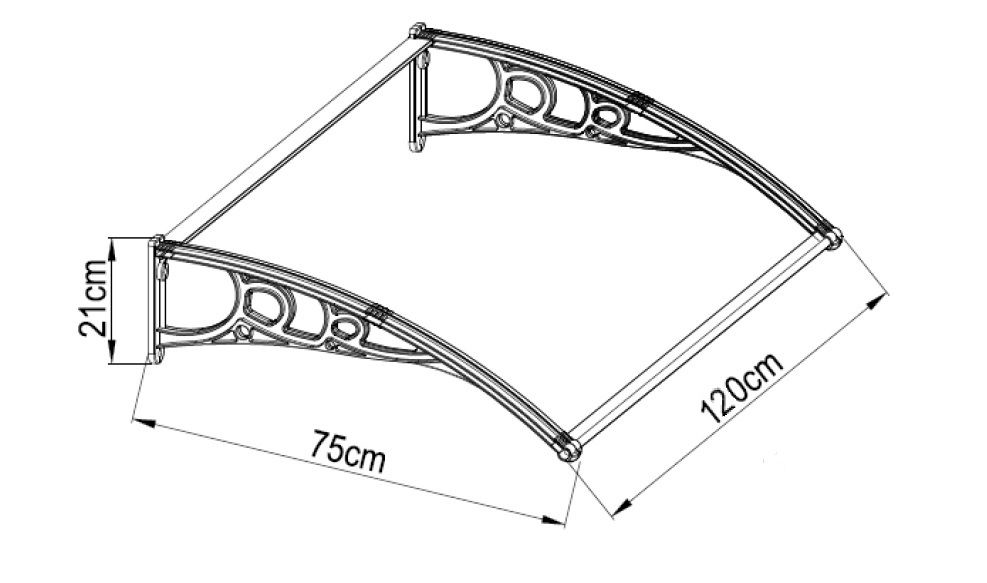 Pensilina L120x75 cm in policarbonato alveolare spessore 5,2 mm, staffe nere in ABS altezza 21cm. Le pensiline sono accoppiabili tra di loro per creare lunghi tratti di copertura. Ideale per portoncini d'ingresso e finestre.