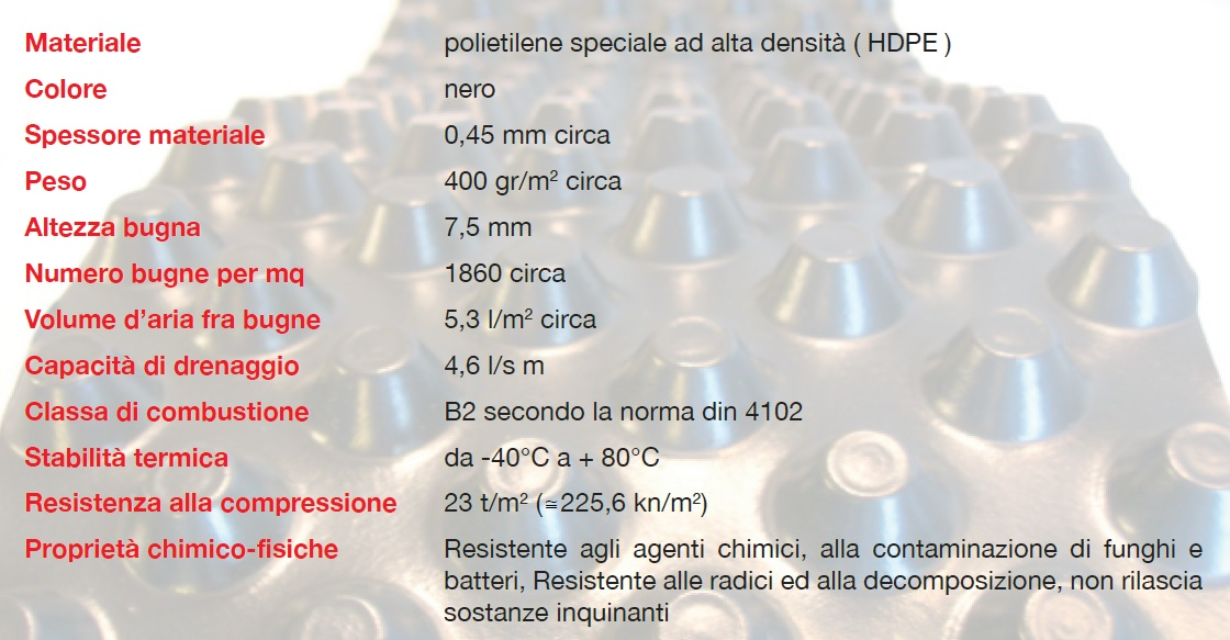La membrana bugnata impermeabilizzante è ideale per proteggere le fondazioni ed i muri interrati, realizzato in HDPE, viene posato sulla superficie delle murature e consente una totale separazione tra i muri, sia di calcestruzzo che in muratura, e l’umidità del terreno, grazie alla presenza di oltre 1850 bugne al mq, che tenendo staccata la membrana di circa 7,5 mm, formano un volume d’aria pari a 5,3 l/mq.