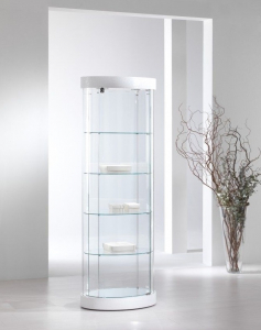 Vetrina ovale piaccola in Ecopelle - cristalli temperati - ripiani regolabili in altezza - Basi e Top H 9 cm - Dimensioni 65 x 44 x 190 cm - Con 2 faretti a led 4000° K.