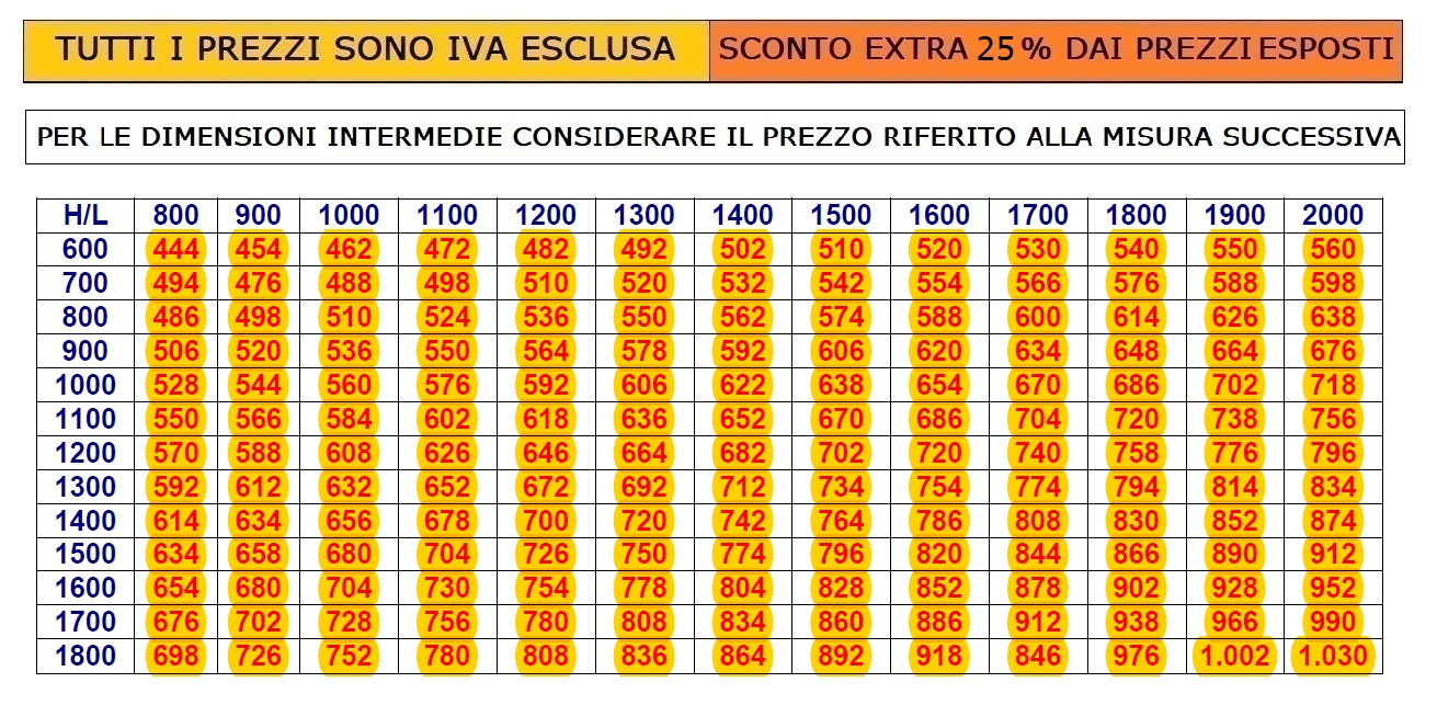 PER ULTERIORI MISURE CONSULTARE LA TABELLA SOTTO - COMPRESO TRASPORTO IN ITALIA- Per preventivi tecnici personalizzati siamo a tua disposizione, mail reparto: commerciale4@italfrom.com , Cellulare e/o Whatsapp (+39) 347.76.92.848 - Se richiesto SERVIZIO MONTAGGIO IN TUTTA ITALIA