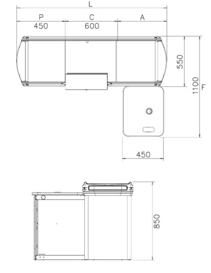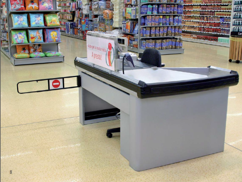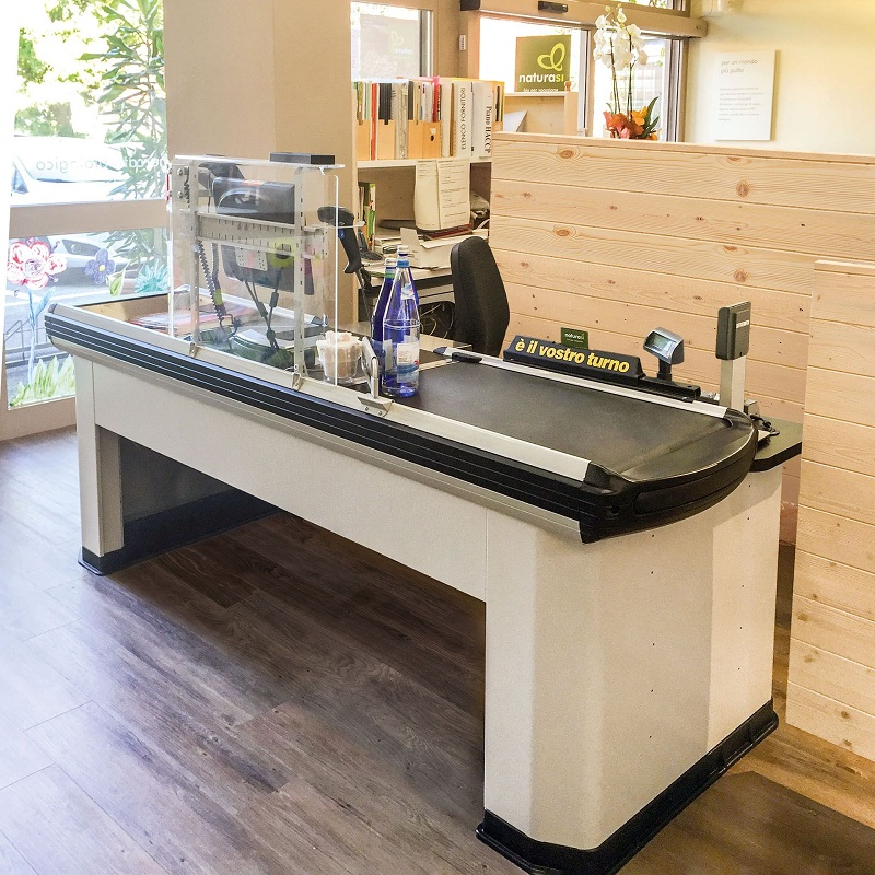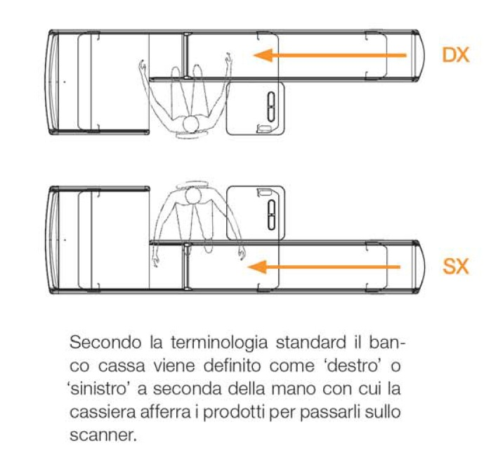 Banco cassa molto compatto indicato per aree di vendita di dimensione particolarmente ridotte. Prevede un piano inox resistente agli urti e graffi, sia nella zona di posizionamento merce da registrare che in quella di raccolta e imbustamento. La presenza nella parte centrale da 600 mm del cassetto portamonete e vano scanner migliora notevolmente l'ergonomia del posto di lavoro, con la posizione di lavoro frontale rispetto al cliente, aumentando però di 200 mm la lunghezza totale del banco.