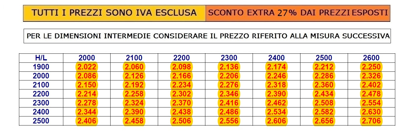 PER ULTERIORI MISURE CONSULTARE LA TABELLA SOTTO - COMPRESO TRASPORTO IN ITALIA- Per preventivi tecnici personalizzati siamo a tua disposizione, mail reparto: commerciale4@italfrom.com , Cellulare e/o Whatsapp (+39) 347.76.92.848 - Se richiesto SERVIZIO MONTAGGIO IN TUTTA ITALIA