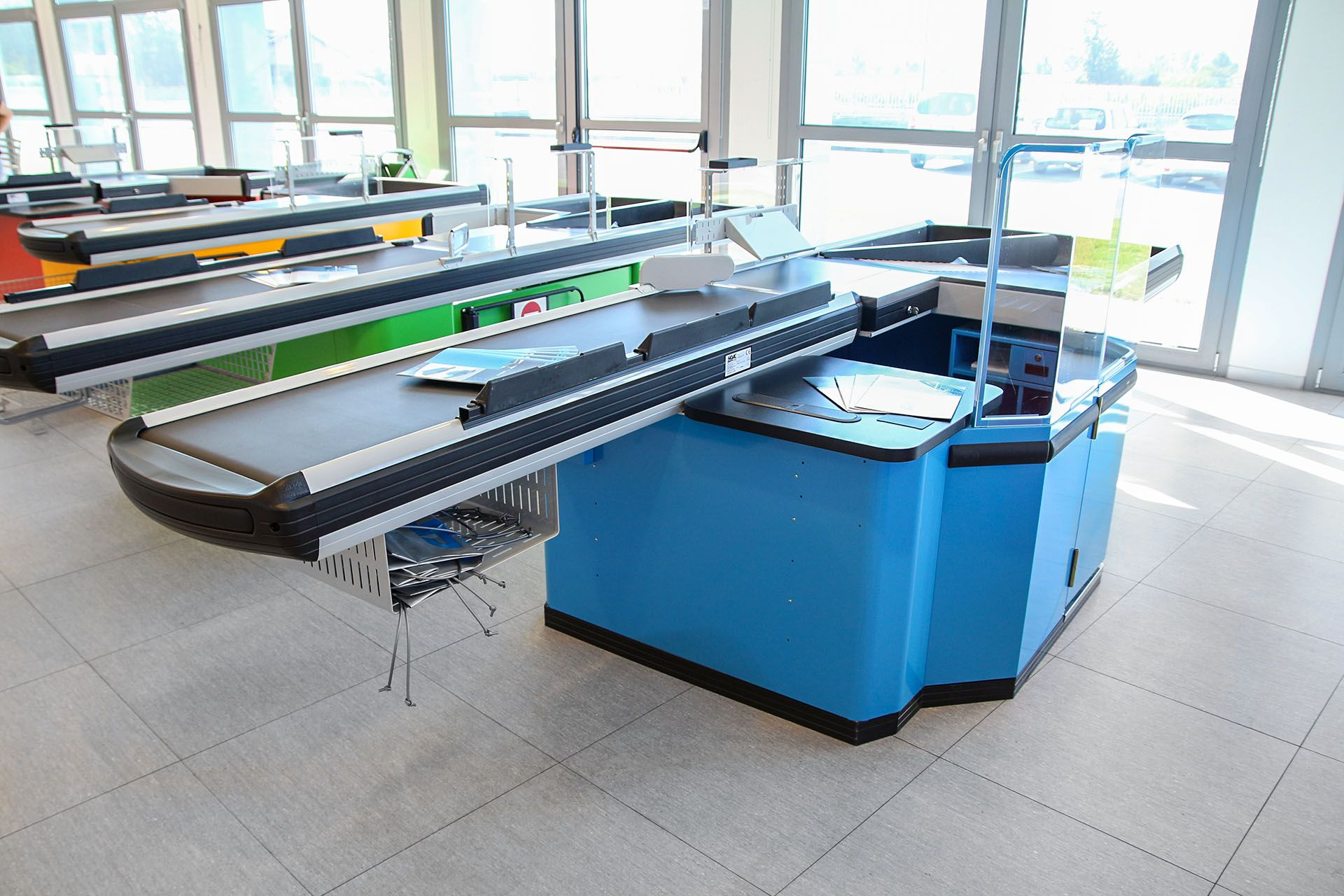 Banco cassa tradizionale adeguato per dimensione e funzione a tutte le aree vendita dal Superette o minimercato (superficie di vendita tra i 100 ed i 399 m²) all'Ipermercato (superficie di vendita superiore ai 2500 m²). L'ampiezza della vasca posteriore permette l'insacchettamento della merce per due clienti contemporaneamente ed offre quindi un adeguato servizio pur contenendo l'ingombro totale. La parte centrale - da 600 mm - permette l'alloggiamento dello scanner e del cassetto portamonete ribaltabile consentendo all'operatore di lavorare in posizione ergonomica e frontale rispetto al cliente.