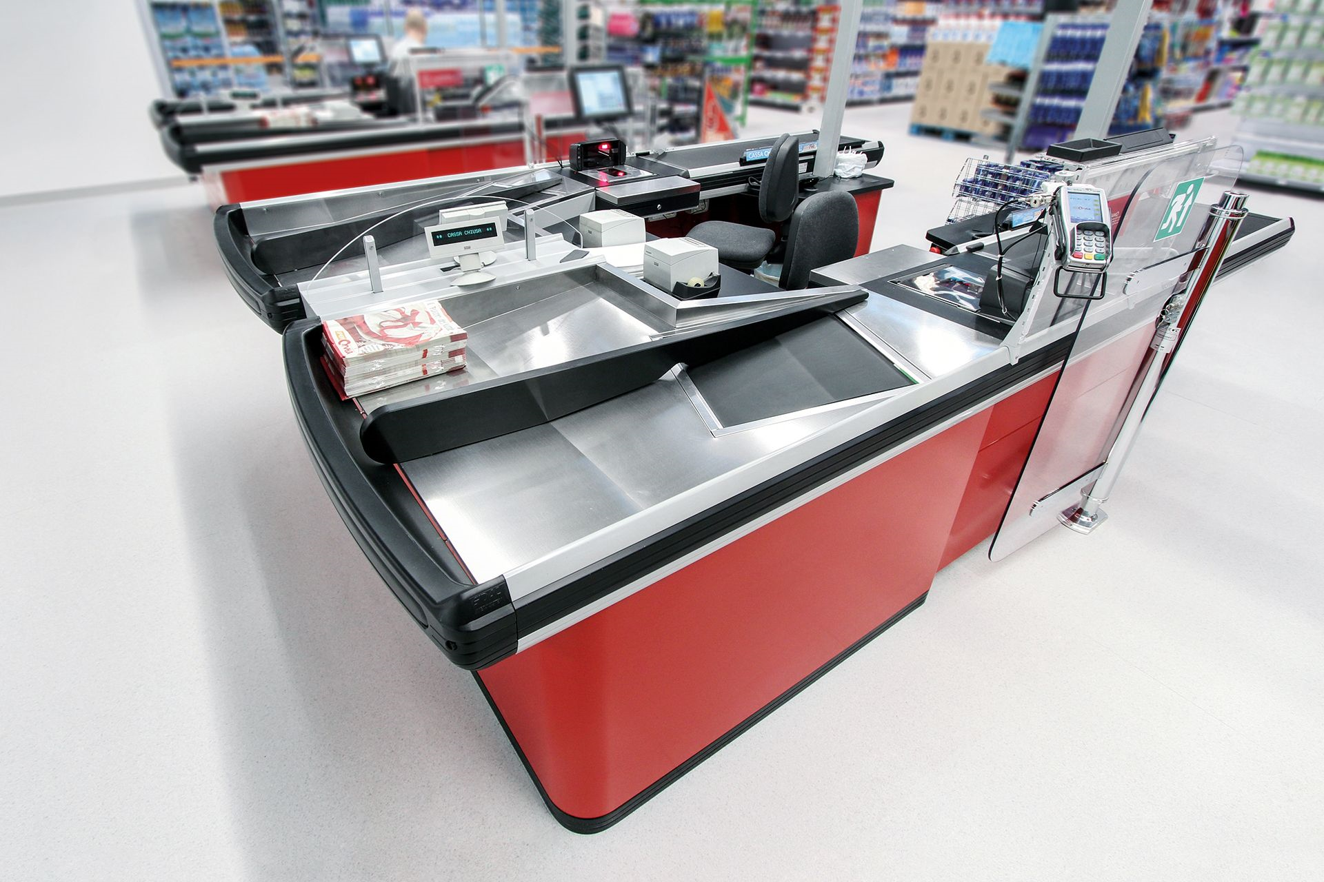 Banco cassa tradizionale adeguato per dimensione e funzione a tutte le aree vendita dal Superette o minimercato (superficie di vendita tra i 100 ed i 399 m²) all'Ipermercato (superficie di vendita superiore ai 2500 m²). L'ampiezza della vasca posteriore permette l'insacchettamento della merce a due clienti contemporaneamente ed offre quindi un adeguato servizio pur contenendo l'ingombro totale. La parte centrale - da 600 mm - permette l'alloggiamento dello scanner e del cassetto portamonete ribaltabile consentendo all'operatore di lavorare in posizione ergonomica e frontale rispetto al cliente.