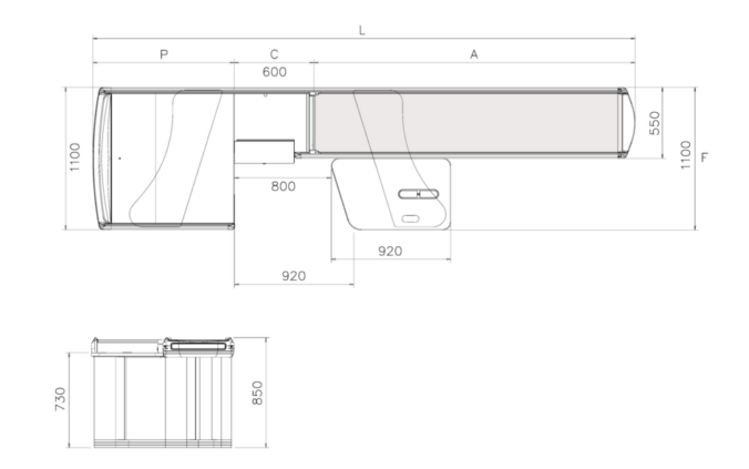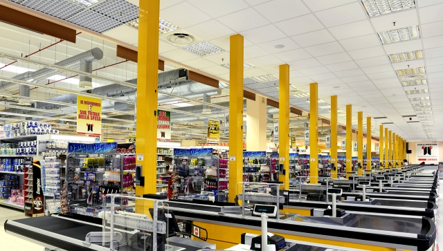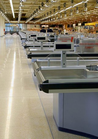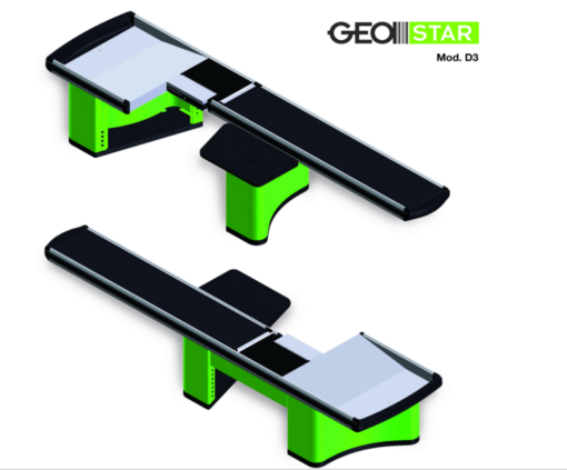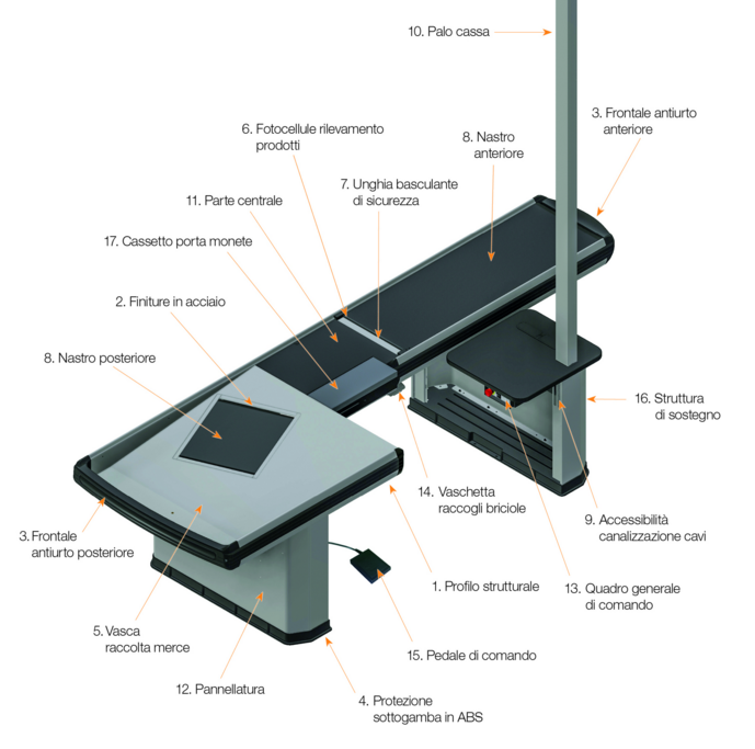 Banco cassa tradizionale adeguato per dimensione e funzione a tutte le aree vendita dal Superette o minimercato (superficie di vendita tra i 100 ed i 399 m²) all'Ipermercato (superficie di vendita superiore ai 2500 m²). L'ampiezza della vasca posteriore permette l'insacchettamento della merce a due clienti contemporaneamente ed offre quindi un adeguato servizio pur contenendo l'ingombro totale. La parte centrale - da 600 mm - permette l'alloggiamento dello scanner e del cassetto portamonete ribaltabile consentendo all'operatore di lavorare in posizione ergonomica e frontale rispetto al cliente.