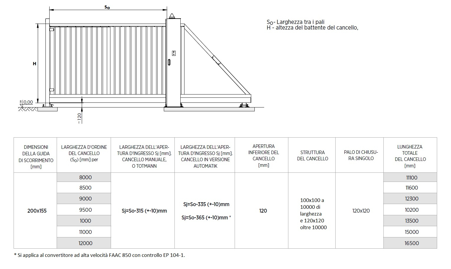 • anta in costruzione chiusa con profilati 100 x 100 mm per cancelli da So = 10000 mm e 120x120 mm da So > 10000 mm;