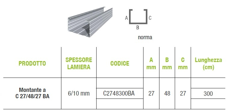 Il montante a C è un accessorio che viene usato per l'orditura metallica, tali profili son in lamiera d'acciaio zincato ed hanno uno spessore di lamiera da 6/10 mm. La lunghezza della singola barra è di 300 cm. La sigla BA significa che la barra ha i bordi arrotondati.