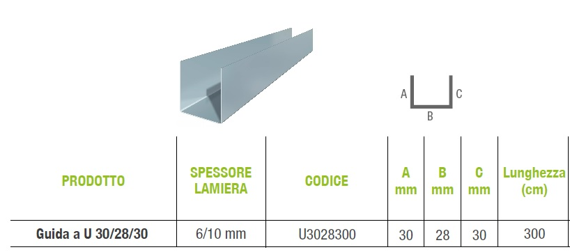 GUIDA A U 30/28/30 - PROFILO PER CARTONGESSO - Lunghezza Barra 300 cm -