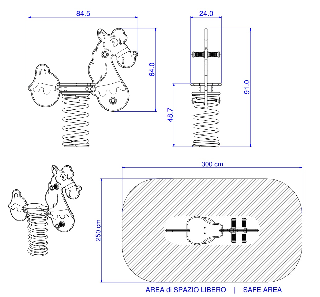Questa variante indica il gioco a molla completo. Include la base per il fissaggio nel terreno tramite fondazione (art. 116 del listino), la molla con diamentro 200mm ed altezza 400mm, l'intera sagoma e tutta la viteria necessaria per il montaggio.Questo tipo di molla è solitamente usata per aree pubbliche o parchi dove le strutture gioco non sono supervisionate.