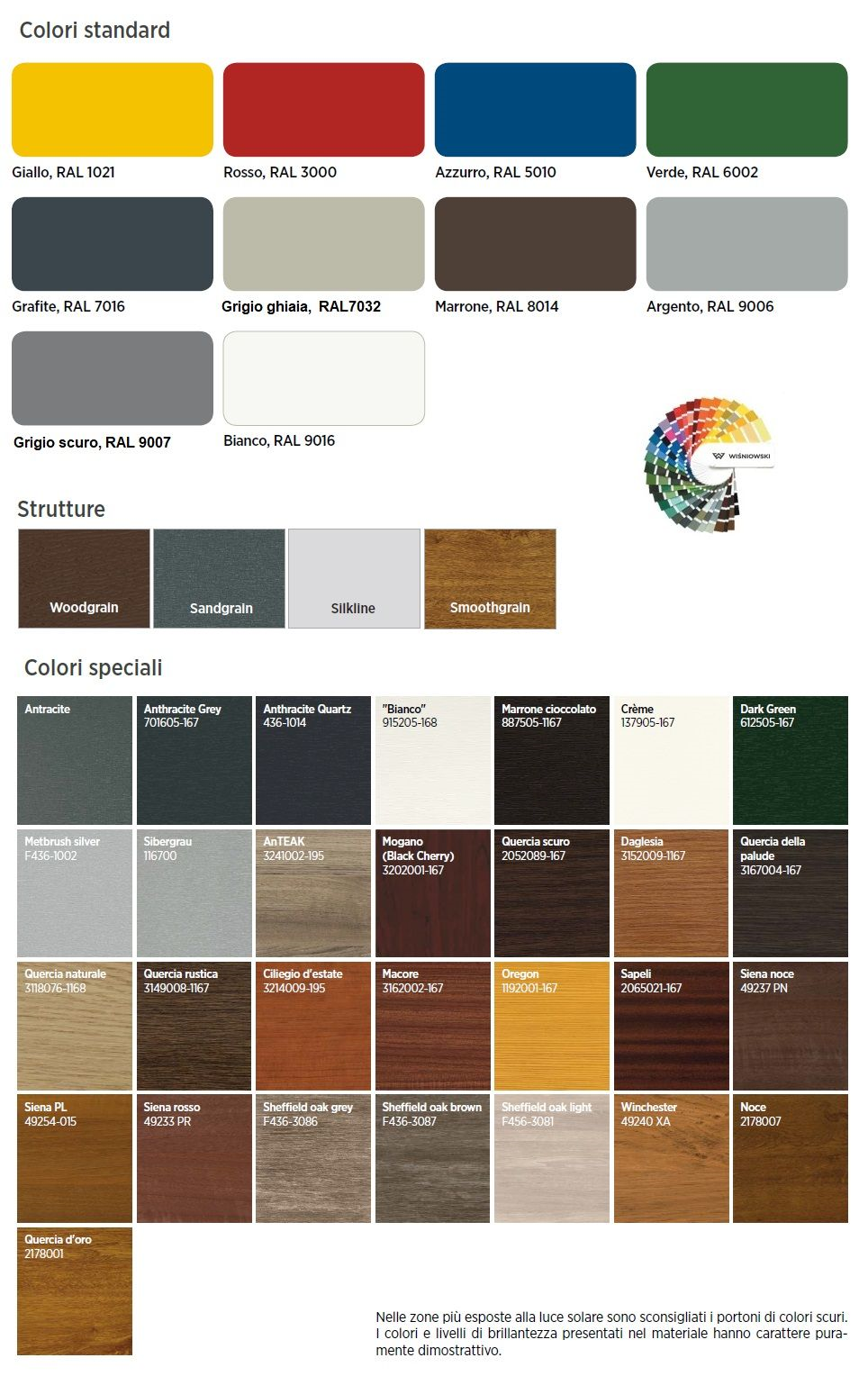 impiallacciate, protette con ferramenta di lamiera in acciaio zincata. La sezione inferiore è dotata di una guarnizione che aderisce al suolo e quella superiore di guarnizione che aderisce all'architrave, quando il portone è chiuso. I pannelli sono dotati di protezioni antischiacciamento delle dita e di guarnizioni nei punti di contatto dei due pannelli. Nei portoni di altezze diverse, architravi diverse o con dotazione diversa la disposizione delle grecature o delle vetrazioni può variare. Coefficiente di penetrazione del calore per il pannelloU = 0,48 [W/m2xK].