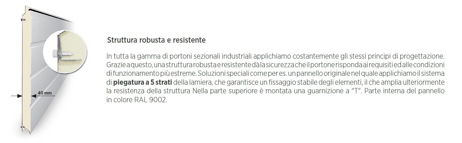 • Ogni portone ha un sistema di guarnizioni flessibili e resistenti lungo l'intero perimetro e tra i pannelli, che aumenta notevolmente l'isolamento del portone.