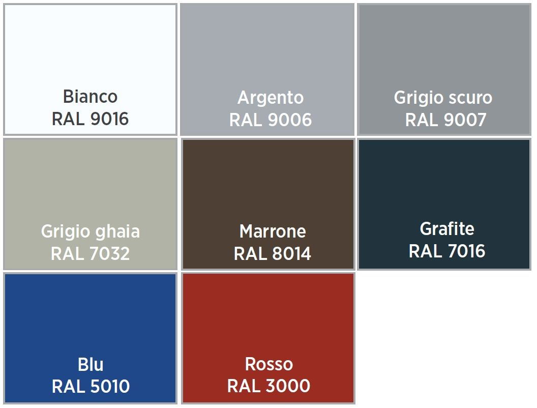 Colori Standard a Scelta* tra Bianco,Argento, Grigio scuro, Grigio Ghiaia, Marrone, Grafite, Rosso e Blu.