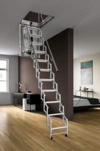 Scala retrattile motorizzata e coibentata a pantografo per soffitta. Struttura mobile realizzata in lamiera stampata 15/10 verniciata bianca. La struttura mobile è unita da perni in acciaio che consentono un