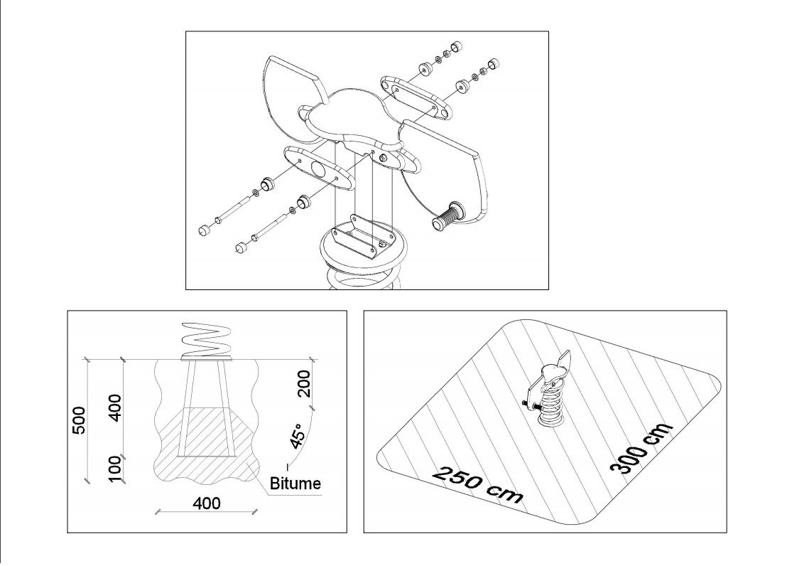 Questa variante indica il gioco a molla completo. Include la base per il fissaggio su superfici rigide come cemento (art. 125 del listino), la molla con diametro 200mm ed altezza 400mm, l'intera sagoma e tutta la viteria necessaria per il montaggio.