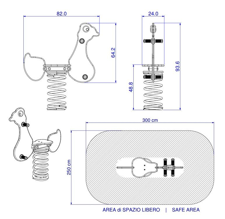 Questa variante indica il gioco a molla completo. Include la base per il fissaggio su superfici rigide come cemento (art. 125 del listino), la molla con diametro 200mm ed altezza 400mm, l'intera sagoma e tutta la viteria necessaria per il montaggio.
