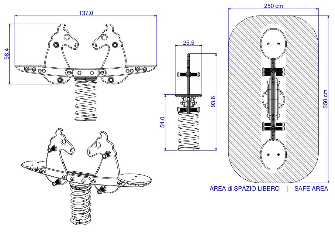 Questa variante indica il gioco a molla completo. Include la base per il fissaggio su superfici rigide come cemento (art. 125 del listino), la molla con diametro 200mm ed altezza 400mm, l'intera sagoma e tutta la viteria necessaria per il montaggio.