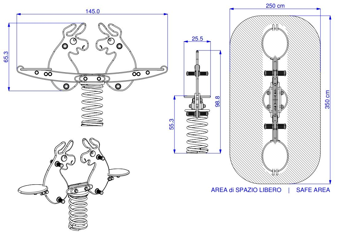 Questo tipo di molla è solitamente usata per aree pubbliche o parchi dove le strutture gioco non sono supervisionate.La viteria per il fissaggio a terra non viene fornita. Essa dipende dalla tipologia di superficie e viene solitamente scelta dall'installatore.