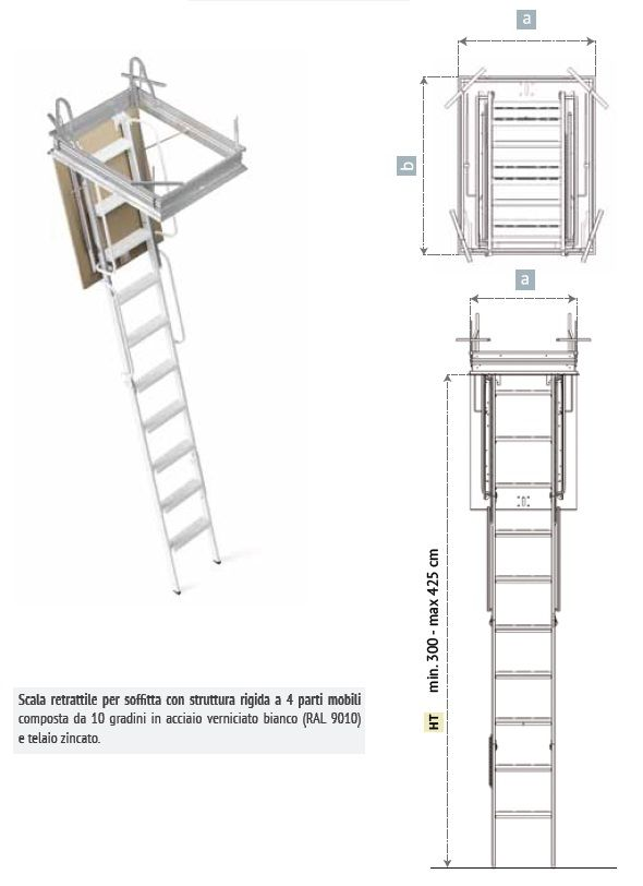 Scala retrattile per soffitta con struttura rigida a 4 parti mobili composta da 10 gradini in lamiera stampata 15/10 e verniciata bianco (RAL 9010) e struttura mobile costruita in tubolare d’acciaio (50 x 20 mm) e molle ammortizzatrici e di richiamo per facilitare l’apertura e la chiusura della scala.