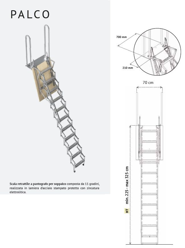 Scala retrattile per soppalco a pantografo composta da 11 gradini e struttura mobile realizzati in lamiera stampata 15/10 zincata e da molle ammortizzatrici e di richiamo che facilitano l’apertura e la chiusura della scala.