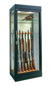 La vetrina è allestita con rastrelliera portafucili in legno, pannello posteriore in tessuto verde acqua, piano in cristallo spostabile su cremagliera ed illuminazione con 2 faretti LED.