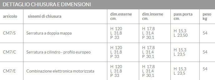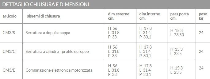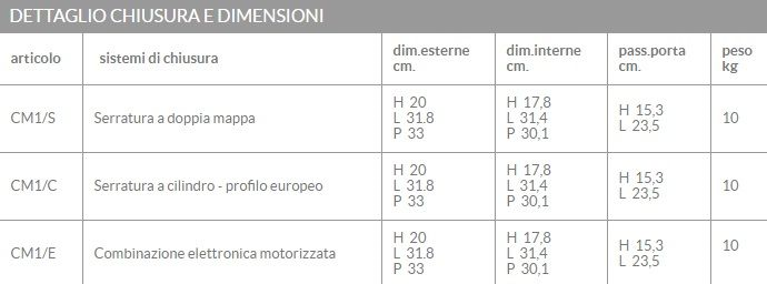 Le cartelliere blindate vengono realizzate in lamiera di acciaio speciale di 1a scelta S235JR, dello spessore di 2 mm. Porta dello spessore di 4 mm . Le cassettire blindate della serie CM1 hanno 3 possibili sistemi di chiusura. Sportello con Serratura a chiave a doppia mappa, sportello con serratura comandata da cilindro a profilo europeo di sicurezza, oppure con serratura elettronica motorizzata. Possono essere assemblate tra di loro all'esterno oppure possono essere inserite negli armadi della serie Armadi di sicurezza con sistema modulare.
