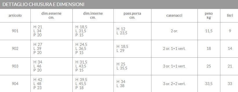 Hanno un sistema di chiusura con catenacci di diam. cm. 22 e riferma con serratura di sicurezza a doppia mappa con chiave femmina a 8 leve (VDS KL.1 - EN 1300 CL.A). La serratura è protetta da una piastra di acciaio al manganese.