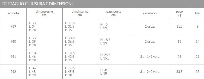 Hanno un sistema di chiusura con catenacci girevoli e anti taglio di diam. cm. 22 e rifermati da combinazione elettronica digitale alimentata con pile alcaline, più alimentazione di emergenza con contatti sulla tastiera. La serratura è protetta da una piastra di acciaio al manganese.