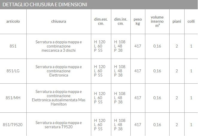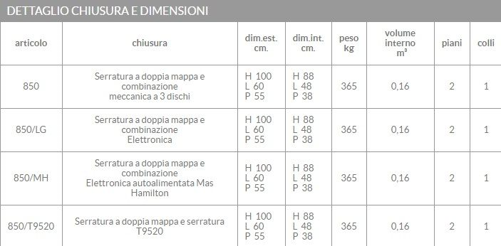 Hanno un sistema di chiusura a triplice espansioni azionante 4 catenacci orizzontali e 2 verticali di diam. 32. Il sistema è azionato da una maniglia frizionata e rifermata con serratura di sicurezza a doppia mappa con chiave femmina a 8 leve (VDS KL.1 - EN 1300 CL.A) e combinazione numerica a 3 dischi coassiali formante un milione di combinazioni, oppure da combinazione elettronica. Le due riferme, con un doppio sistema indiretto, lavorano indipendenti l'una dall'altra.