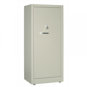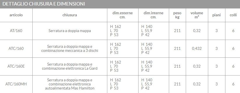 CARATTERISTICHE TECNICHE Grazie alla loro struttura, realizzata con una doppia parete all'interno della quale è compresso un materiale ad alto potere isolante, garantiscono un'efficiente protezione agli sbalzi termici provocati da piccoli incendi o esposizione a fonti di calore. L’armadio è realizzato in lamiera di acciaio speciale di 1a scelta S235JR, dello spessore di mm.3 ed internamente, ad eccezione della parete posteriore, abbiamo una pannellatura in lamiera di acciaio dello spessore di mm.1 che rende invisibili tutti i bulloni di montaggio. Le cerniere degli sportelli sono predisposte internamente allo sportello, rendendole non accessibili allo scasso (ns. brevetto n. 205519 del 1983). Il sistema di chiusura è composto da cremagliera a triplice espansione azionante 4 catenacci orizzontali, uno verticale superiore ed uno verticale inferiore diam. mm. 22 e 2 barre laterali di incastro fiancata-sportello. Il sistema è azionato da una maniglia frizionata che in caso di forzatura oltre certi limiti slitta evitando di rovinare il sistema stesso. Riferma realizzata con serratura a chiave femmina a doppia mappa a 8 leve con chiave non estraibile ad armadio aperto. Il sistema può essere integrato da combinazione numerica a 3 dischi coassiali formante un milione di combinazioni, da combinazione elettronica, oppure da combinazione elettronica autoalimentata "Mas Hamilton".Le suddette serrature sono protette da una piastra di acciaio al manganese imperforabile al trapano.