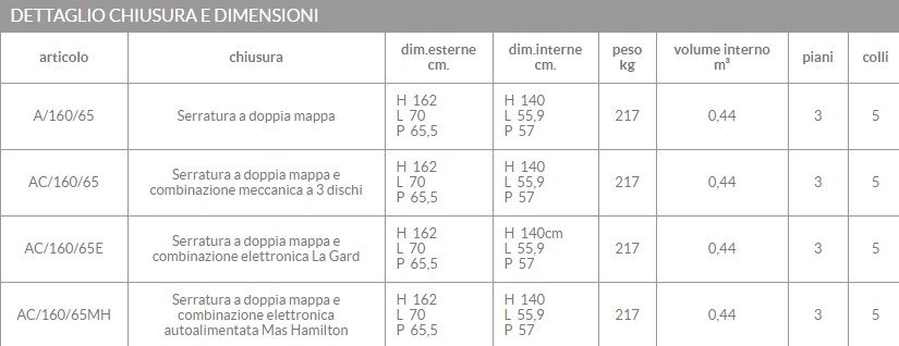 L’armadio è realizzato in lamiera di acciaio speciale di 1a scelta S235JR, dello spessore di mm.3 ed internamente, ad eccezione della parete posteriore, abbiamo una pannellatura in lamiera di acciaio dello spessore di mm.1 che rende invisibili tutti i bulloni di montaggio. Le cerniere degli sportelli sono predisposte internamente allo sportello, rendendole non accessibili allo scasso (ns. brevetto n. 205519 del 1983). Il sistema di chiusura è composto da cremagliera a triplice espansione azionante 4 catenacci orizzontali, uno verticale superiore ed uno verticale inferiore diam. mm. 22 e 2 barre laterali di incastro fiancata-sportello. Il sistema è azionato da una maniglia frizionata che in caso di forzatura oltre certi limiti slitta evitando di rovinare il sistema stesso. Riferma realizzata con serratura a chiave femmina a doppia mappa a 8 leve con chiave non estraibile ad armadio aperto. Il sistema può essere integrato da combinazione numerica a 3 dischi coassiali formante un milione di combinazioni, oppure da combinazione elettronica, oppure da combinazione elettronica autoalimentata "Mas Hamilton". Le suddette serrature sono protette da una piastra di acciaio al manganese imperforabile al trapano. Allestimento interno Internamente possiamo avere 3 versioni: Versione A composta da 3 piani spostabili su cremagliera. Versione C compostada 1 piano tutta larghezza, 1 appendiabiti, 1 tramezza verticale e 3 pianetti piccoli. VerniciaturaLa verniciatura nel colore Griglo (ral 7032) in finitura bucciata è realizzata a forno, con polveri epossipoliestere, previa sgrassatura e fosfatizzazione a caldo in tunnel, ed essiccata in galleria termica ad una temperatura di 200° C.
