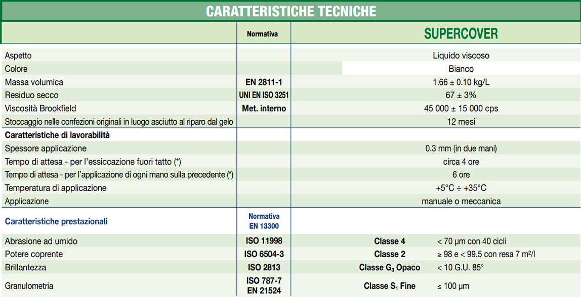 SUPERCOVER è una idropittura decorativa per superfici interne, a base di copolimeri vinilici in emulsione, pigmenti selezionati e cariche minerali ad alta copertura. Dopo essiccazione forma un film caratterizzato da elevata permeabilità al vapore, ottima copertura, con discreta resistenza allo sfregamento.