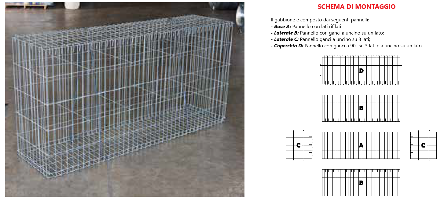L’elemento scatolare in rete elettrosaldata di acciaio zincato a maglia rettangolare è completato attraverso il riempimento, che può essere realizzato scegliendo tra una serie di pietre naturali, in funzione del risultato e dell’efficacia estetica che si intende ottenere. I gabbioni sono disposti in file sovrapposte a gradoni prevedendo al di sotto dell’opera una fondazione.