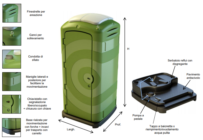 Materiale: Box esterno, tettuccio traslucido, pedana e serbatoio reflui wc in LLDPE, stabilizzato anti UV, prodotti con la tecnologia dello stampaggio rotazionale. Riciclabile al 100%. Funzionamento: I reflui, convogliati nell'apposito serbatoio di accumulo e opportunamente trattate con l’agente disgregante, vengono riutilizzata per il risciacquo della turca grazie alla pompa a membrana azionata a pedale. Normativa di riferimento: UNI EN 16194 Accessori standard: Appendiabiti, portarotolo, specchio, golfari per il sollevamento. Accessori optional ( a richiesta) : dispenser gel lavamani, lavabo, carrello per il trasporto.