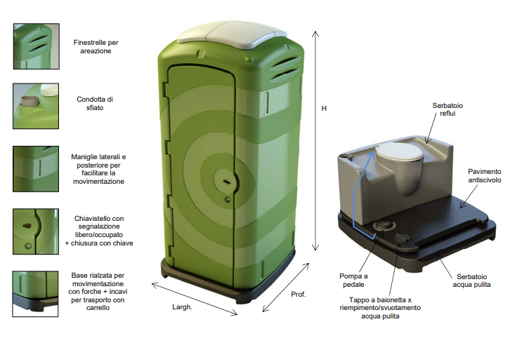 Colori standard: Verde (RAL simil 6025) o Blu (RAL simil 5017). Altri colori su richiesta; possibilità di personalizzazione con pellicola decorativa adesiva Materiale: Box esterno, tettuccio traslucido, pedana e serbatoio reflui wc in LLDPE, stabilizzato anti UV, prodotti con la tecnologia dello stampaggio rotazionale. Riciclabile al 100%. Funzionamento: Sono presenti due serbatoi completamente separati, quello in cui vengono convogliati i reflui e in cui è alloggiato l’agente disgregante e quello (corrispondente alla pedana) in cui è presente acqua pulita. Quest’ultima, grazie ad una pompa a membrana azionata a pedale, viene utilizzata per il risciacquo del vaso. Normativa di riferimento: UNI EN 16194 Accessori standard: Appendiabiti, portarotolo, specchio. Accessori optional: dispenser gel lavamani, lavabo, carrello per il trasporto, orinatoio, golfari per il sollevamento.