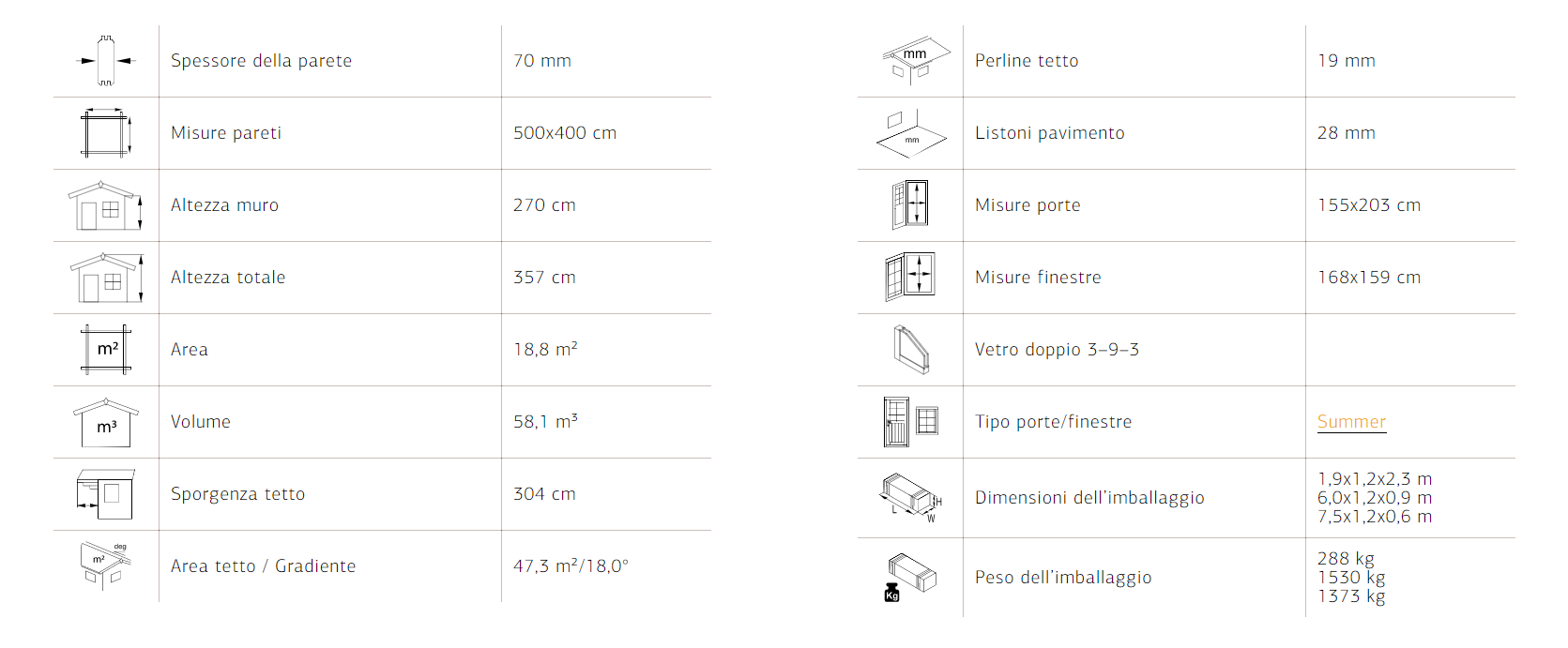 NB! Il contenuto del pacco può variare a seconda del modello. La descrizione di ogni modello di casetta include l’elenco dei dettagli essenziali.