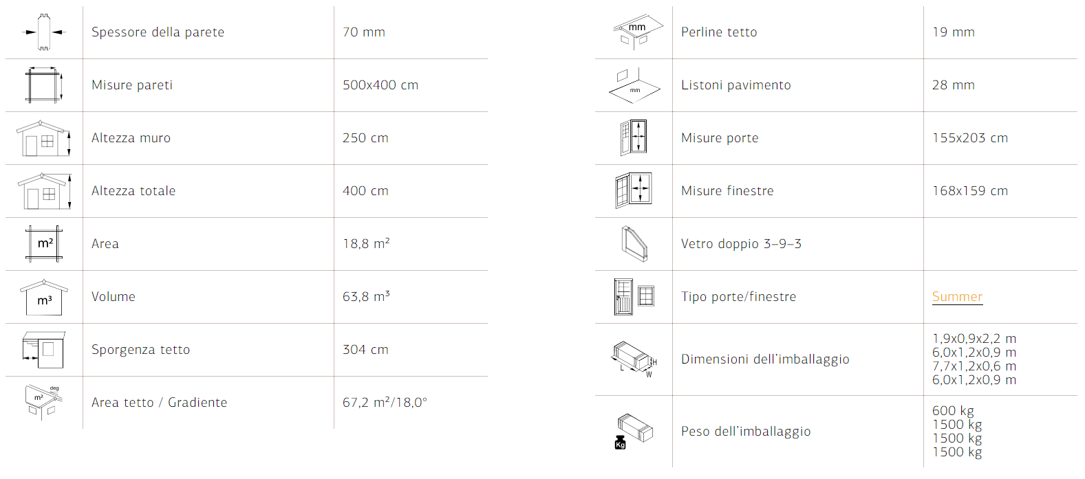 NB! Il contenuto del pacco può variare a seconda del modello. La descrizione di ogni modello di casetta include l’elenco dei dettagli essenziali.