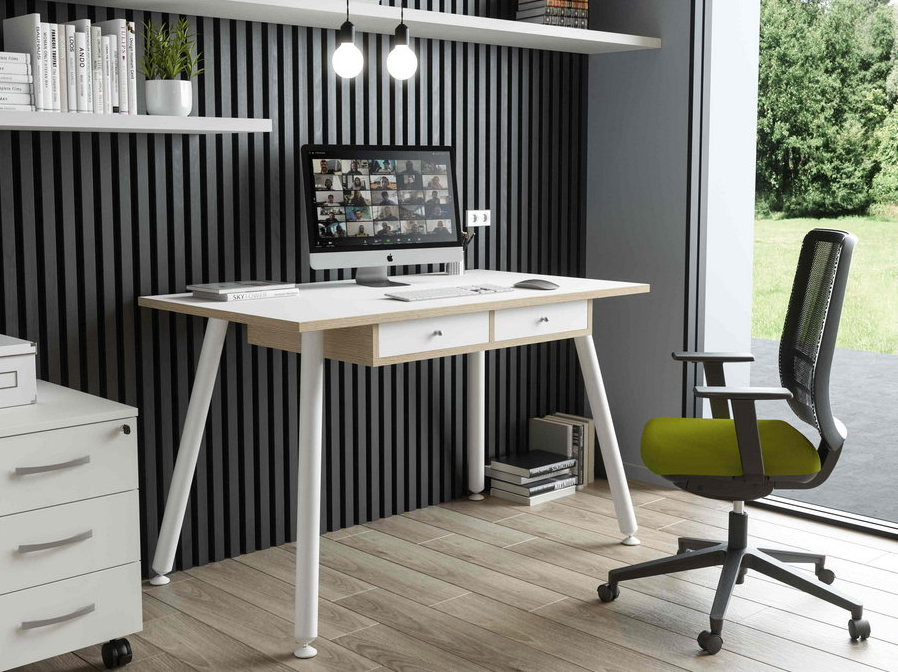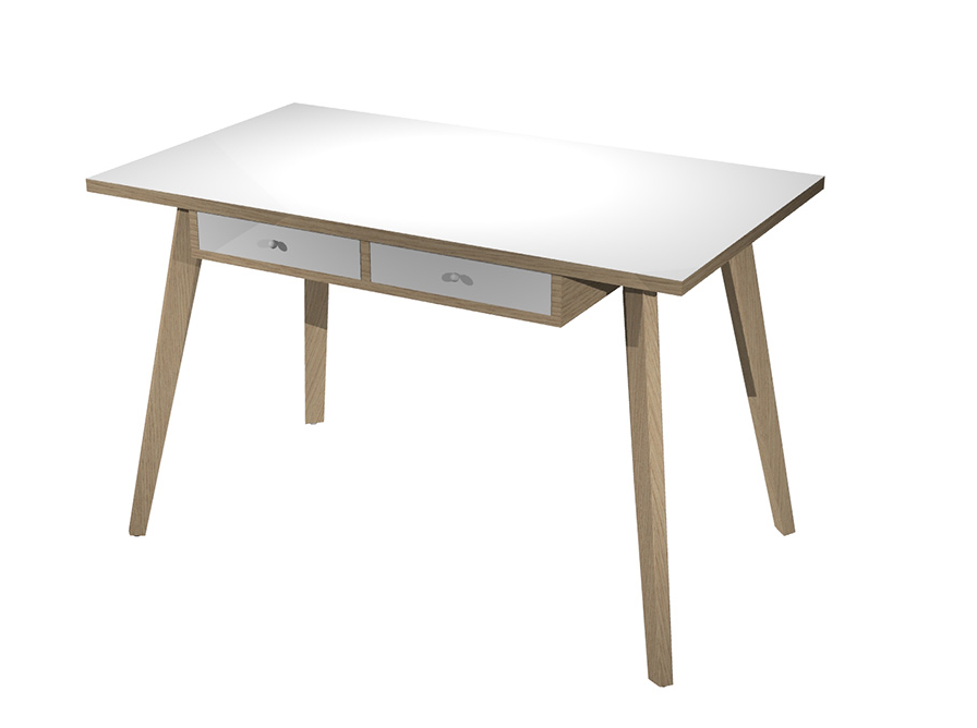 Piano scrivania in spessore 22 mm . Materiale in melaminico antigraffio ed antiriflesso con bordo in spessore arrotondato, con assenza di spigoli vivi. Gambe inclinate in legno massello (K143) o metallo (K67) bianche o nere.
