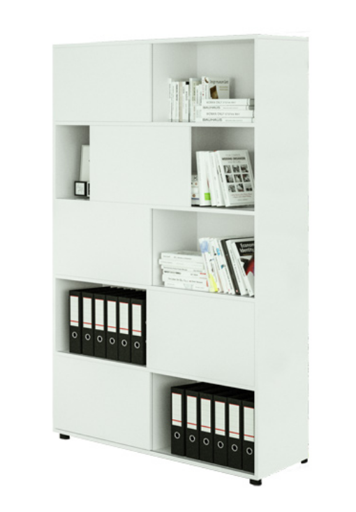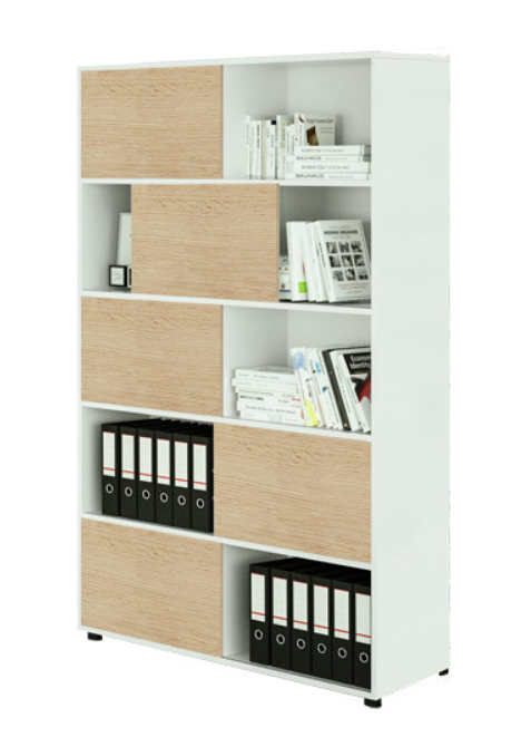 Ante scorrevoli opzionali in più finiture. Libreria finitura bianco cera. Piedini regolabili. Imballo tutto in cartone, facilmente riciclabile. Sistema qualità certificato ISO 9001.