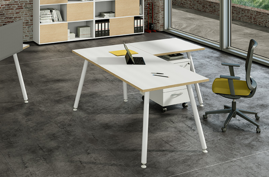 Scrivania Bench a 2 postazioni di lavoro con piano in spessore 22 mm, profondità 166 cm e varie lunghezze: 120,140,160,180 cm. Altezza scrivania 744 mm.