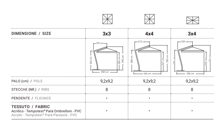 • possibilità di fissaggio al suolo • parti metalliche prima zincate, poi verniciate • con stecca antivento tra palo verticale e ragno • stecche intercambiabili • stecche diagonali 4x4 rinforzate • girevole 360° • ombrellone standard fornito con pendente • Inclusa Base + Carter Copribase in acciaio zincato verniciato