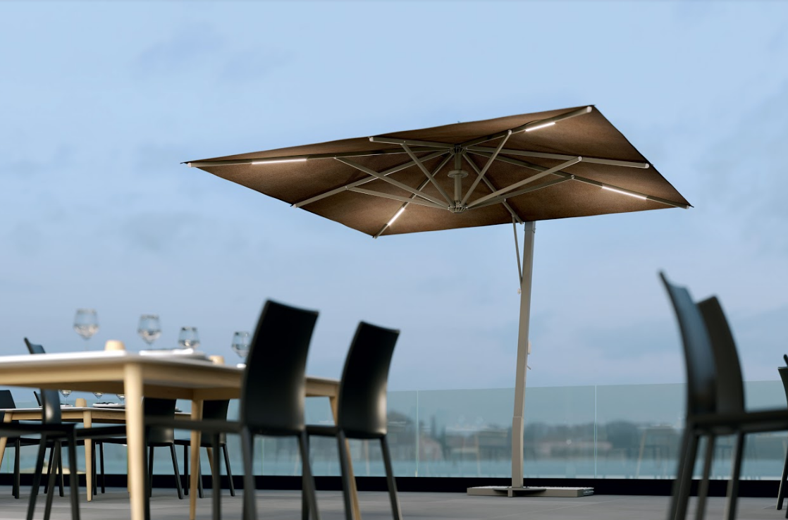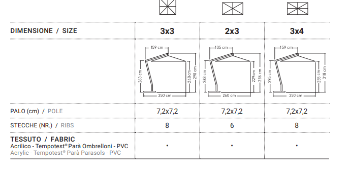 • possibilità di fissaggio al suolo • parti metalliche prima zincate, poi verniciate • con stecca antivento tra palo verticale e ragno • stecche intercambiabili • girevole 360° • Inclusa Base + Carter Copribase in acciaio zincato verniciato • ombrellone standard fornito senza pendente