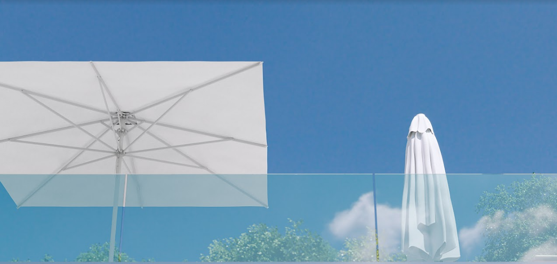 • possibilità di fissaggio al suolo • stecche intercambiabili • stecche diagonali 4x4 rinforzate • ombrellone standard fornito con pendente • sistema a doppio ragno che consente la chiusura sopra i tavoli sottostanti • completo di base + carter copribase Varianti colori struttura